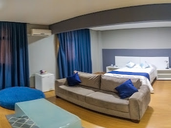 Com 43 m², este quarto apresenta três ambientes. Apresenta ar-condicionado, uma mini cozinha, cama box, frigobar e TV LCD com Canais a cabo e acesso a internet Wi-Fi. O banheiro privativo inclui secador de cabelo.